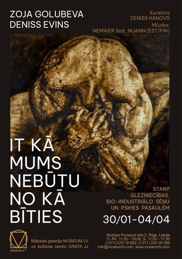 Such an attempt to chart the space of fear has been created by two artists, Zoja Golubeva and Deniss Evins. Their artistic languages and means of expression differ. They range from digital technologies and electronic waste to mirror illusions of obsolete mechanisms, and to Deniss’s solitary kombucha cultures that search for a way to speak about loneliness. Zoja’s canvases, which refer the viewer to the classical tradition of European Baroque painting, tell stories of despair, solitude, and the horror of the inner darkness of the human self.