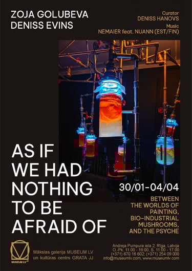 Šādu mēģinājumu, fiksēt biedējošā telpu, ir radījuši divi mākslinieki – Zoja Golubeva un Deniss Evins. Atšķiras viņu rokraksti un mākslinieciskās izteiksmes līdzekļi: no digitālajām tehnoloģijām un datoratkritumiem, caur atdzīvojušos mehānismu spoguļilūzijām līdz Denisa vientuļajiem tējas sēņu “indivīdiem”, kuri sapņo atrast veidu, kā vēstīt par savu vientulību. Zojas audekli, kas skatītāju atsauc pie klasiskās Eiropas baroka glezniecības tradīcijas, stāsta par izmisumu, vientulību un cilvēka personības iekšējās tumsas šausmām.